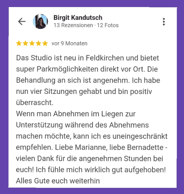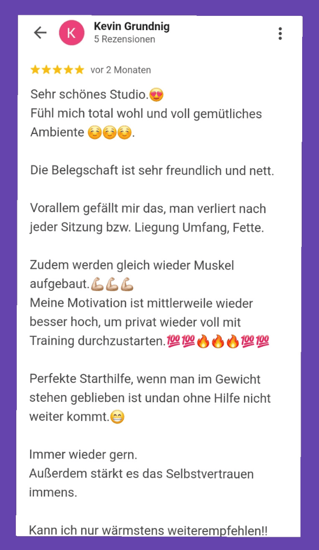 Unsere einzigartige Methode führt dich in kurzer Zeit zu deinem Traum-Body. Bereits nach der ersten Behandlung verlierst du 2-5cm deines Körperumfangs. Du glaubst uns nicht? Kein Problem! Sollte dieses Ergebnis nicht eintreffen, brauchst du die Probebehandlung nicht zu bezahlen. Somit besteht für dich absolut kein Risiko.